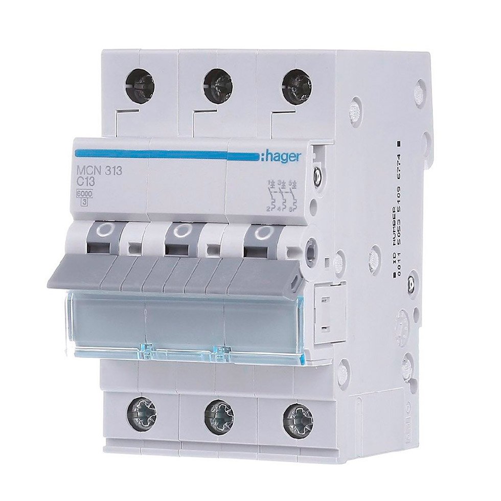 Автоматичний вимикач Hager 3-полюсний з номінальним струмом 13A та характеристикою відключення «C» забезпечує надійний захист електричних мереж. Максимальний струм короткого замикання 6kA. Артикул MCN313. Виробник - Hager.