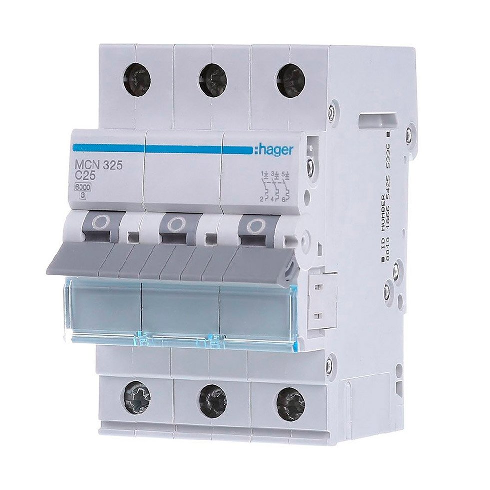 Автоматичний вимикач Hager 3-полюсний з номінальним струмом 25A та характеристикою відключення «C» забезпечує надійний захист електричних кіл від перевантажень та коротких замикань. Максимальний струм короткого замикання 6kA. Виробник – Hager. Артикул - MCN325.