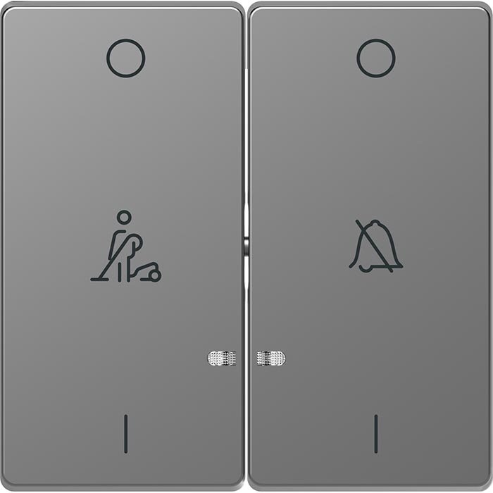 Подвійна клавіша з піктограмами «перекреслений дзвінок» і «покоївка». Використовується для вимикачів: 2-клавішних механізмів вимикача і 2-клавішного кнопкового вимикача.– Механізми для клавіші потрібно придбати окремо.