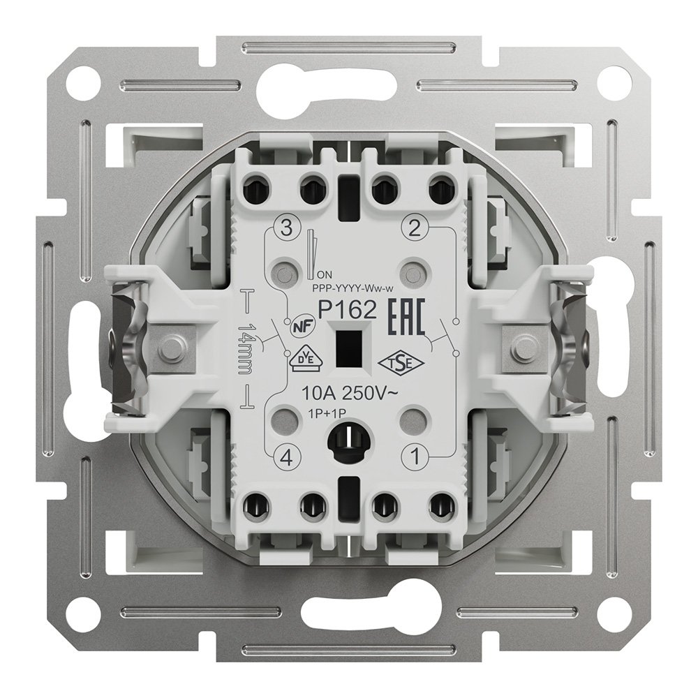 Однотактовий двоклавішний вимикач для включення / відключення двох незалежних груп світла через імпульсний реле. Принцип звонкового вимикача.– Рамка: купується окремо. У комплекті не постачається.