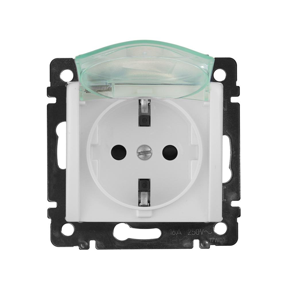 Розетка силова з заземлювальним контактом і кришкою внутрішньої установки.Має високий ступінь захисту - IP44 і може встановлюватися в місцях з підвищеною концентрацією пари або пилу.