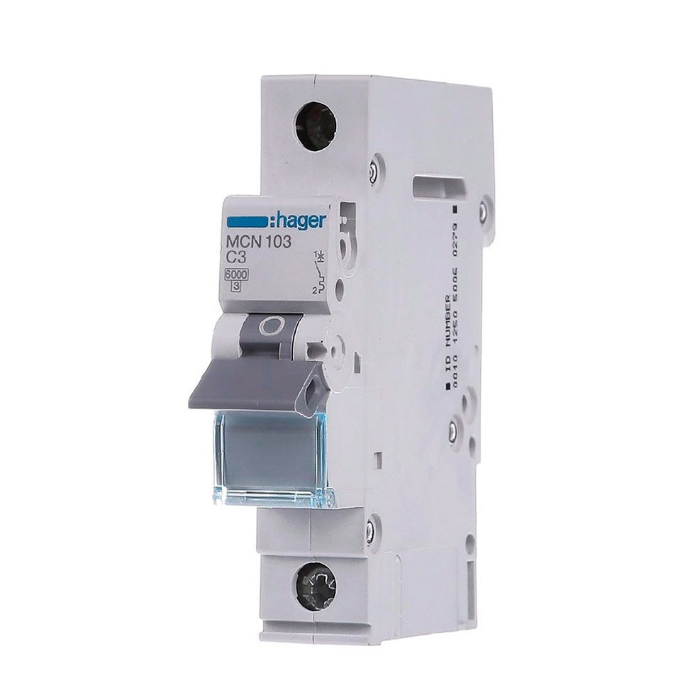 Краткое описание Автоматического выключателя Hager 1-полюсный - 3A - характеристика C - 6kA - MCN103
