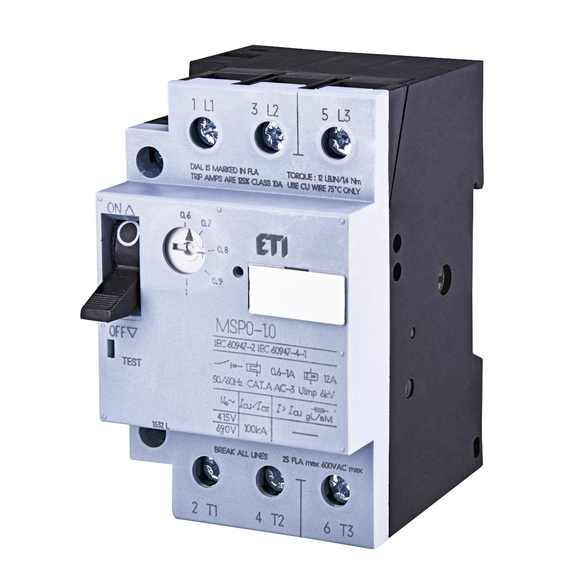 Автоматический выключатель защиты электродвигателя ETI MSP0-1,0 (код для заказа 4646619) предназначен для пуска электродвигателей до 0,25 kW и защиты его от токов коротких замыканий и перегрузок.