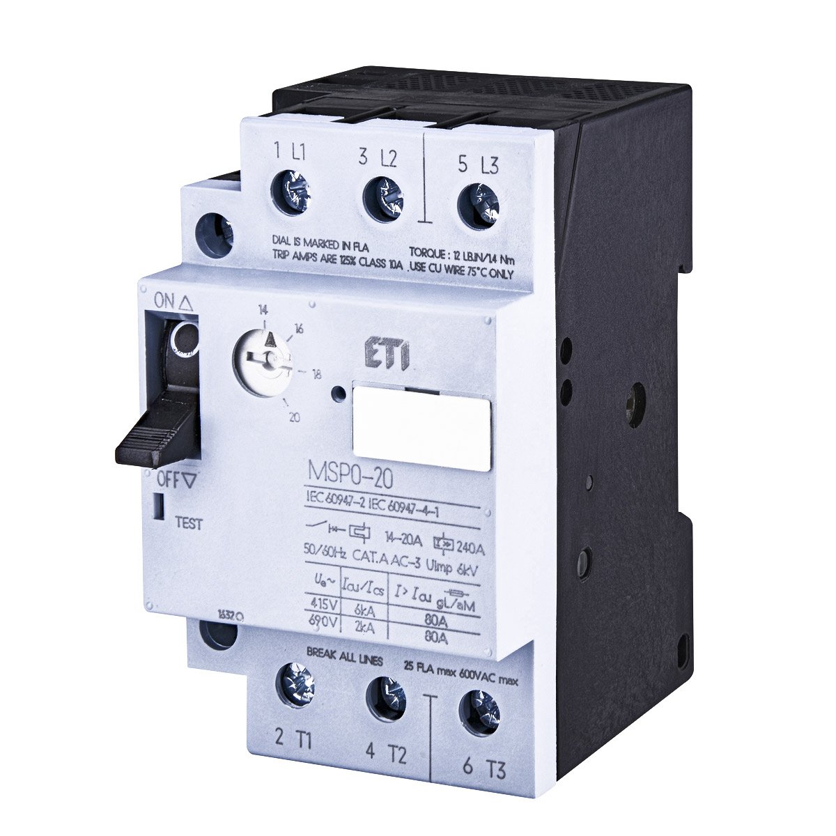Автоматический выключатель защиты электродвигателя ETI MSP0-20 (код для заказа 4646626) предназначен для пуска электродвигателей до 9 kW и защиты его от токов коротких замыканий и перегрузок.