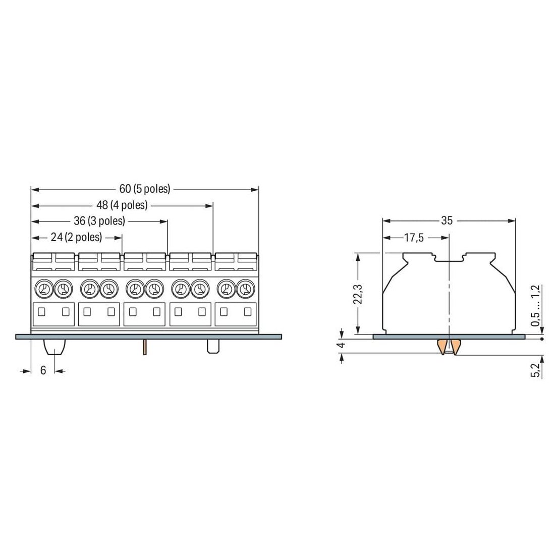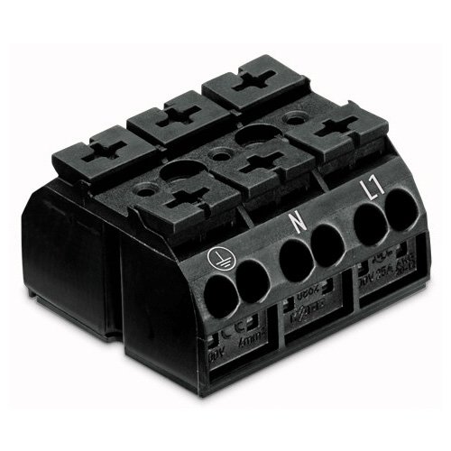 Клемма ваго для подключения проводников 0,5-4мм2, приборов и устройств, 3 полюсная, номинальной нагрузки 32А, 500В, 6кВ, с маркировкой PE-N-L1, крепление клеммы сверху винтом и гайкой М3 или саморезом 2,9мм, цвет черный.