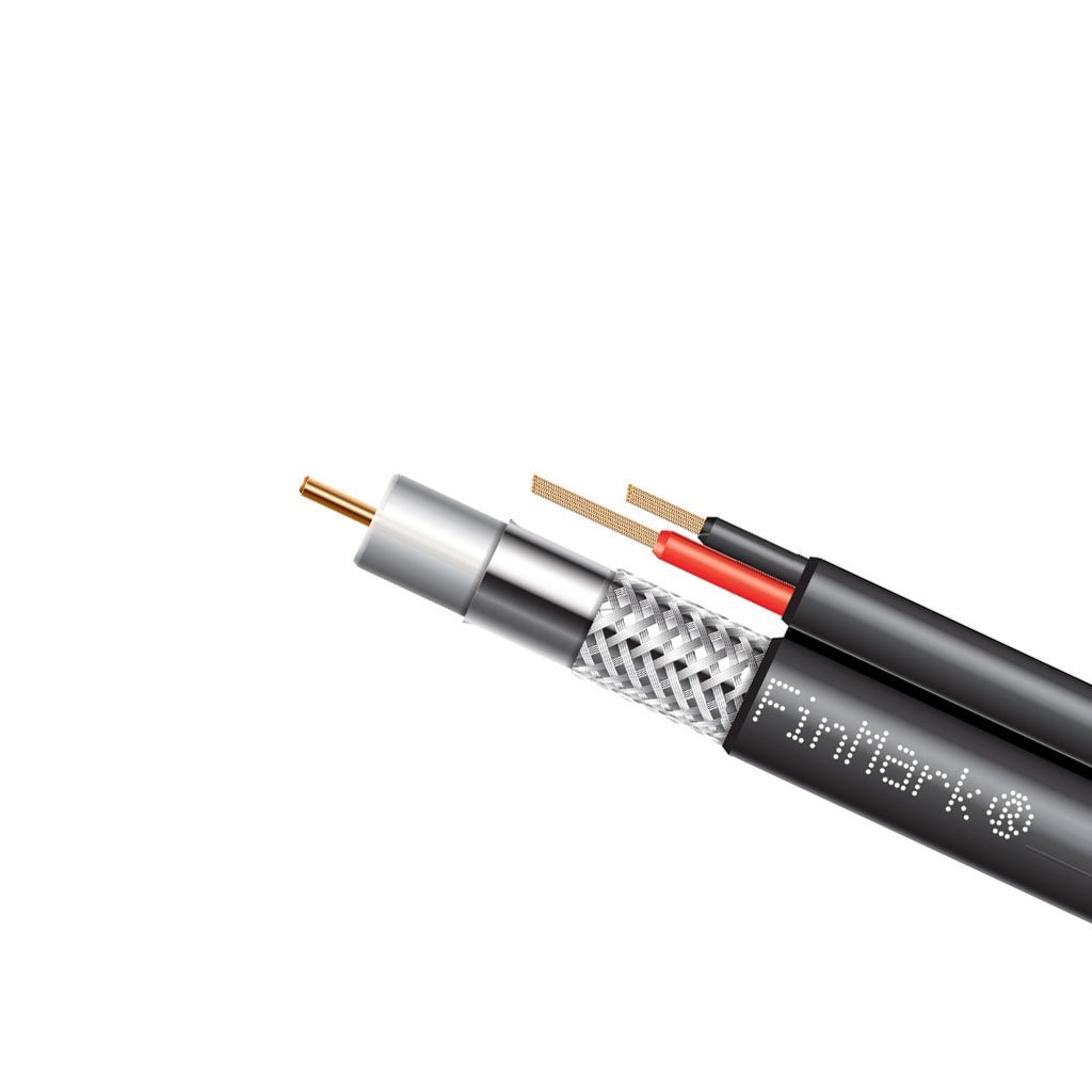 Кабель в разрезе имеет вид «восьмерки» с наружной оболочкой из поливинилхлоридного пластиката. С одной стороны расположена коаксиальная часть, состоящая из омедненного стального центрального проводника, физически вспененного полиэтиленового диэлектрика, двухслойного экрана из алюминиевой фольги и оплетки 67% плотности заполнения. Вторая часть «восьмерки» имеет два медных проводника, каждый из которых покрыт ПВХ изоляцией. В случае необходимости часть кабеля с токоведущими жилами может быть легко отделена от общей конструкции. Для идентификации проводники имеют разную цветовую окраску (красный и черный). В целях удобства разделки кабеля предусмотрена специальная нить для продольного вскрытия оболочки. Доступен кабель F 5967BV black-2x0.75power FinMark с черным и F 5967BV white-2x0.75power FinMark с белым цветом наружной оболочки.