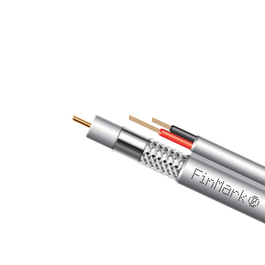 Кабель в разрезе имеет вид «восьмерки» с наружной оболочкой из поливинилхлоридного пластиката. С одной стороны расположена коаксиальная часть, состоящая из омедненного стального центрального проводника, физически вспененного полиэтиленового диэлектрика, двухслойного экрана из алюминиевой фольги и оплетки 67% плотности заполнения. Вторая часть «восьмерки» имеет два медных проводника, каждый из которых покрыт ПВХ изоляцией. В случае необходимости часть кабеля с токоведущими жилами может быть легко отделена от общей конструкции. Для идентификации проводники имеют разную цветовую окраску (красный и черный). В целях удобства разделки кабеля предусмотрена специальная нить для продольного вскрытия оболочки. Доступен кабель F 5967BV black-2x0.75power FinMark с черным и F 5967BV white-2x0.75power FinMark с белым цветом наружной оболочки.