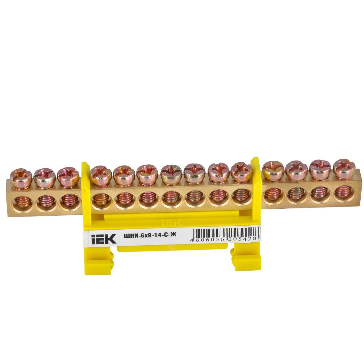 Шина с изолятором ШНИ-6х9-14-С-Ж от IEK предназначена для электрического и механического соединения нулевых, защитных и фазных проводников.